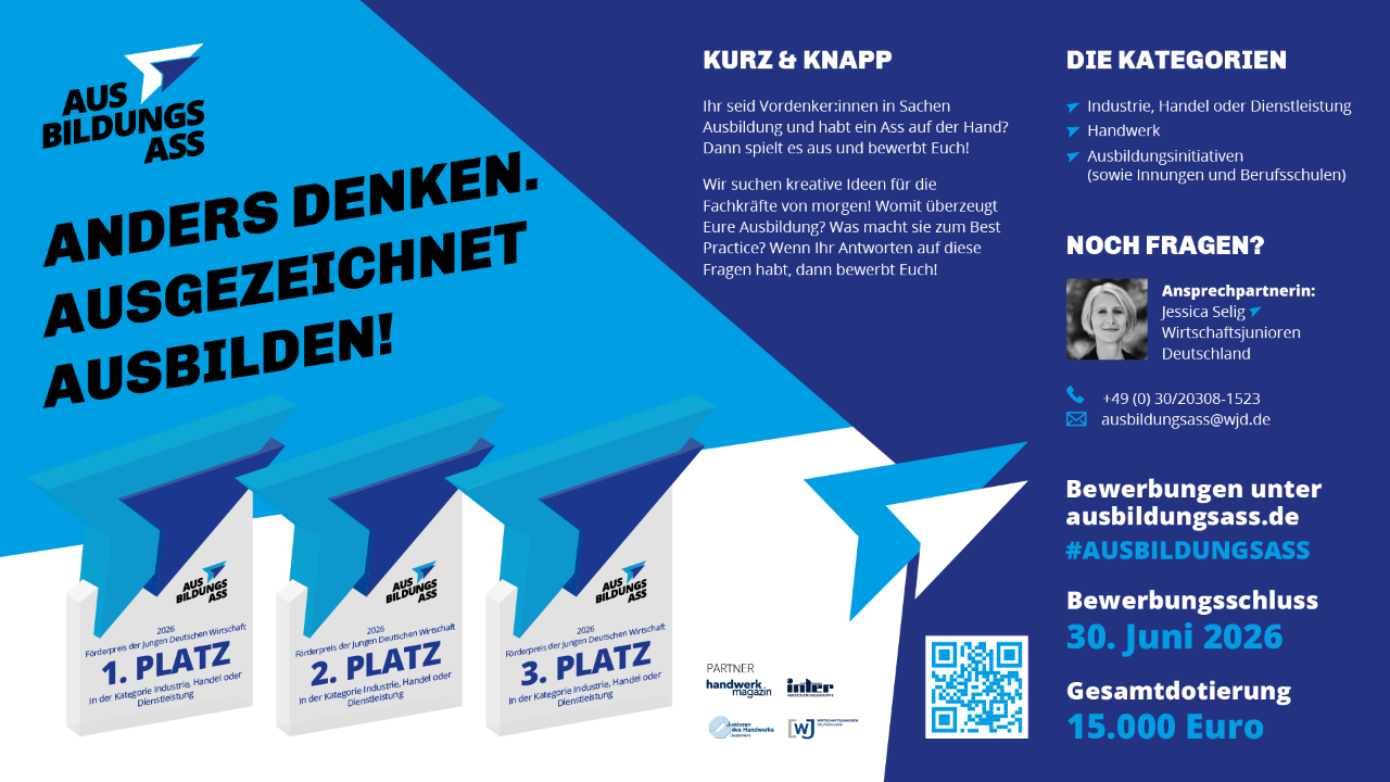 Bewerbt Euch beim Ausbildungs-Ass 2025 und messt Euch mit anderen Ausbildungskonzepten aus ganz Deutschland. Eure Ausbildung ist innovativ und einfach einmalig? Dann stellt Euch dem Wettbewerb, sichert Euch den Titel als Deutschlands bester Ausbilder und positioniert Euer Unternehmen als Vordenker in Sachen Ausbildung. Die Auszeichnung ist mit insgesamt 15.000 Euro dotiert.