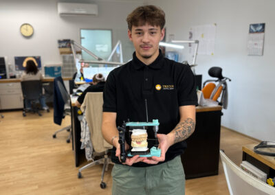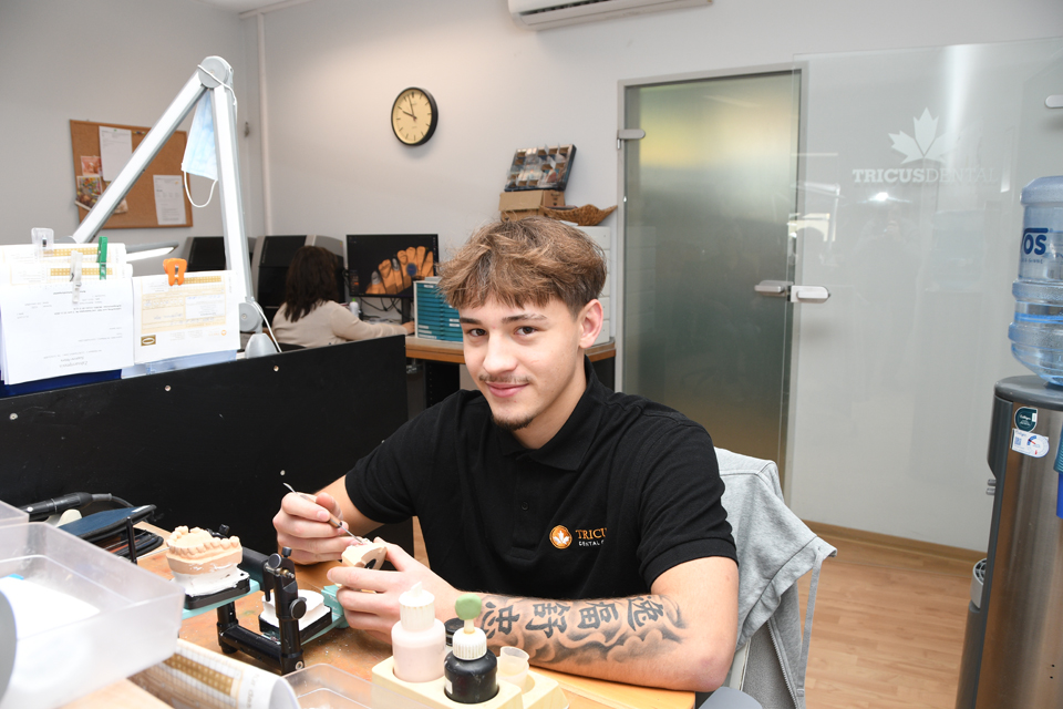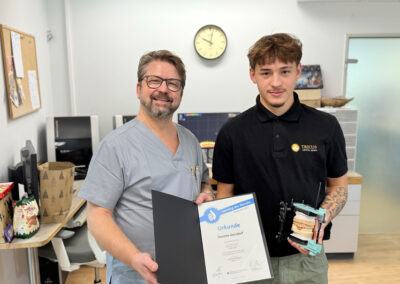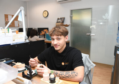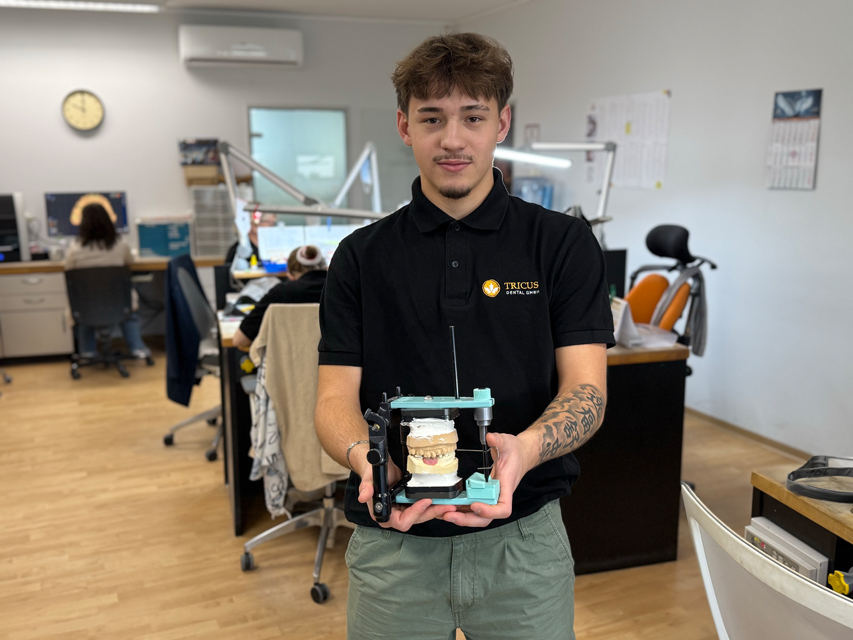 „Ich habe schon immer gern rumgewerkelt. Mit meinem Vater in seiner Werkstatt. Aber ich habe auch selbst viel gebastelt. Kleine und feine Sachen, die viel Fingerfertigkeit erfordern, haben mir schon immer gelegen. Eigentlich wäre ich gern Goldschmied geworden. Aber für diesen Beruf gab es in der Region um Seelow einfach keine Ausbildungsplätze. Es war meine Mutter, die dann sagte, dass es auch den Beruf des Zahntechnikers gäbe. Ich hatte damals keine Ahnung, was die machen. Aber nach einigen Praktika in Laboren in Berlin war schnell klar, dass das etwas für mich sein könnte. Und so begann ich mit der Lehre. Was mir an dem Beruf gefällt? Die Präzision, mit der ich arbeiten muss. Die Abwechslung, denn jedes Gebiss ist anders. Die Verantwortung, die wir Zahntechniker haben. Das familiäre Team im Labor. Aber auch die Freude von Kunden, wenn wir ihnen helfen konnten. Und dass ich nach der Arbeitszeit länger bleiben darf, um ab und an meinem Hobby zu frönen. Ich habe ein Faible für sogenannte Grillz, aufsteckbaren, temporären Zahnschmuck, den ich zum ersten Mal bei einigen Rappern gesehen hatte. Mein Ziel? Ganz klar. Meine Lehre mit besten Ergebnissen abzuschließen. Dann? Mal sehen…“ notiert von Mirko Schwanitz