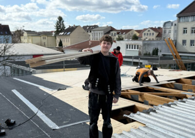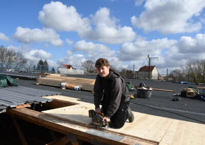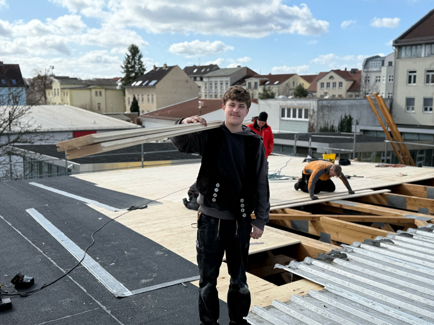„Ich habe schon in den Schulferien bei Herrn Haase mitgearbeitet, dann mein Schülerpraktikum bei ihm gemacht und mich anschließend um eine Lehre beworben. Ich liebe es, auf hohe Dächer zu steigen, an der frischen Luft und körperlich zu arbeiten. Jeden Tag sehe ich, was wir geschafft haben. Das ist ein gutes Gefühl. Klar, die Ausbildung fordert einen schon. Zur überbetrieblichen Ausbildung muss ich nach Großräschen, zur Berufsschule nach Potsdam. Das heißt: Um dreiviertel fünf muss ich los, damit ich pünktlich bin. Aber so ist das, wenn man auf dem Lande wohnt. Jammern war noch nie mein Ding. Ich bin ein optimistischer Mensch, mache gern mal einen Witz. Ich glaube, meine Kolleginnen und Kollegen mögen das. Also nicht, dass ich der Teamclown bin, eher der Gute-Laune-Boy. Was ich vorhabe? Ich plane nicht weit voraus. Die Lehre gut beenden, Praxiserfahrung sammeln – das sind meine Ziele. Und: Ich werde im Betrieb bleiben. Hier sehe ich meine Zukunft. Dächer werden immer gedeckt werden müssen. Lehrling des Monats? Ich wusste gar nicht, dass es so eine Auszeichnung gibt. Dass mich der Chef dafür vorgeschlagen hat, ist eine echte Überraschung. Das Problem: Jetzt muss ich mich noch mehr anstrengen. Nein, nein, war’n Witz. Das mache ich auch so. Ist doch klar.“ notiert von Mirko Schwanitz